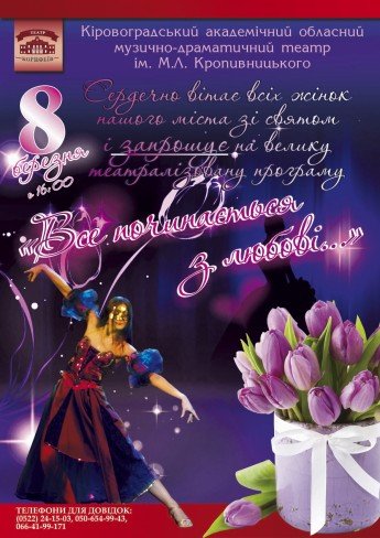 Кіровоградський академічний обласний український музично-драматичний театр ім. М. Л. Кропивницького сердечно вітає всіх жінок нашого міста зі святом і запрошує на велику театралізовану програму.