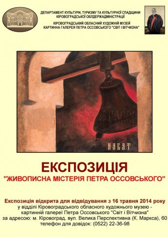 У відділі обласного художнього музею – картинній галереї Петра Оссовського «Світ і Вітчизна» буде відкрито виставку «Живописна містерія Петра Оссовського» до Міжнародного дня музеїв.