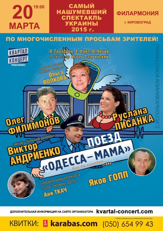 Сегодня юмористический жанр несколько дискредитирован, поэтому зрителю всегда приятно, когда ему напоминают, что такое хорошая комедия. Спектакль «Поезд «Одесса-мама» — как раз такая постановка, в которой театральные эксперименты авторов органично сливаются с точной работой режиссера Игоря Славинского и блестящей актерской игрой Русланы Писанки, Олега Филимонова, Виктора Андриенко, Якова Гоппа.