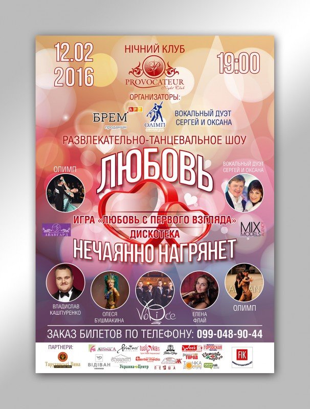 В программе шоу: романтическая игра «Любовь с первого взгляда», концертная программа с участием танцевальных дуэтов клуба спортивного танца «Олимп», известного в Кировограде вокального дуэта в составе Сергея Колчина и Оксаны Яненко, и уже популярного вокалбенда «D.Voice» под руководством Романа Бутовского.