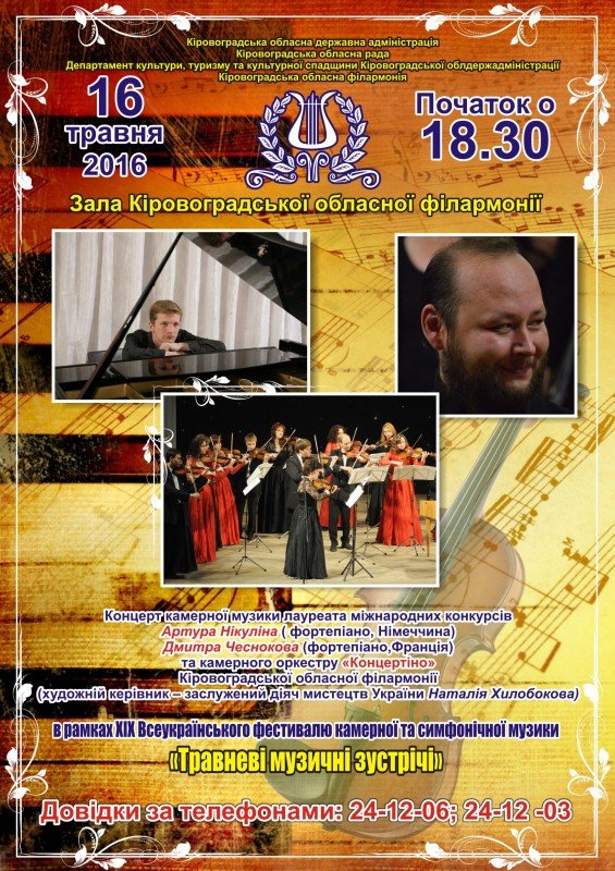 Концерт камерної музики лауреатів міжнародних конкурсів Артура Нікуліна (фортепіано, Німеччина), Дмитра Чеснокова (фортепіано, Франція) та камерного оркестру "Концертіно" Кировоградської обласної філармонії (художній керівник - заслужений діяч мистецтв України Наталія Хилобокова).