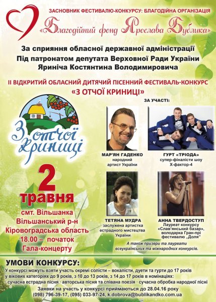 ІІ Відкритий обласний пісенний фестиваль-конкурс «З отчої криниці», з метою розкриття нових яскравих талантів нашої Батьківщини.