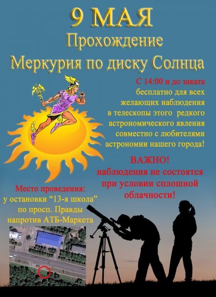 Посмотреть в телескоп можно будет с 14.00 до заката в районе 13 школы напротив АТБ-маркета.