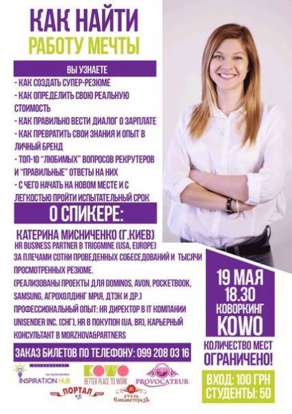Спикер имеет более 10 лет работы в HR, провел более сотни собеседований и отсмотрел тисячи резюме. Знает HR-кухню изнутри и поможет найти подход к любому работодателю. Сейчас занимает пост HR Business Partner в TriggMine (USA, Europe), IT компания-разробник автоматизированных решений. В прошлом: HR директор в IT компании UniSender Inc. (СНГ), HR в Pokupon (UA, BR), карьерный консультант в Morzhova&Partners (реализованы проекты для Dominos, Avon, Pocketbook, Samsung, Агрохолдинг Мрія, ДТЭК т.д)