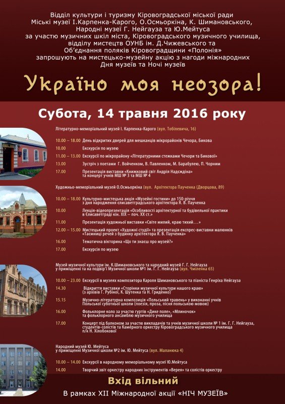 Відділ культури і туризму Кіровоградської міської ради, міські музеї І.Карпенка-Карого, О.Осмьоркіна, К. Шимановського, народні музеї Г. Нейгауза та Ю.Мейтуса за участю музичних шкіл міста, Кіровоградського музичного училища, відділу мистецтв ОУНБ ім. Д.Чижевського та Об’єднання поляків Кіровоградщини «Полонія» запрошують на мистецько-музейну акцію 'Україно моя неозора!" з нагоди міжнародних Дня музеїв та Ночі музеїв.