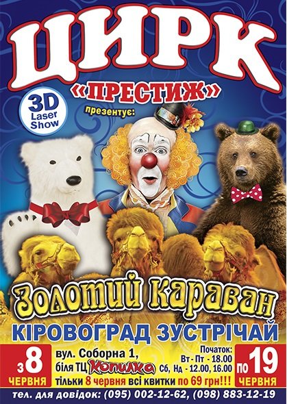 Феерическое иллюзионное шоу Заслуженных артистов Украины. Большая группа дрессированных животных, а так же единственные в Европе танцующие белые медведи! И, конечно же, веселый и озорной клоун Шурик. Подарите себе и вашим детям настоящий праздник цирка!