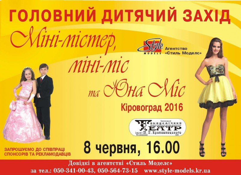 Агентство «Стиль моделс» презентує головний конкурс дитячої краси та творчості Кіровоградщини «Міні-містер, міні міс та Юна міс Кіровоград 2016»!