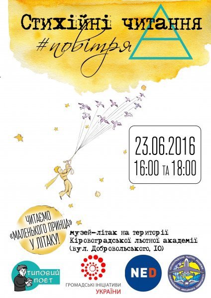 На вас чекають: - незабутні враження від віртуального польоту в інтерактивному музеї-літаку Кіровоградської льотної академії - Театр Вух – унікальний формат театрального мистецтва, коли аудиторії для сприймання надається живе аудіальне втілення твору! - сеанс Відеопоезії - можливість зачитати улюблені фрагменти з творчості Антуана де Сент-Екзюпері - міні-ярмарок виробів ручної роботи наших талановитих майстринь - смаколики та багато інших приємних сюрпризів! Зібрані гроші підуть на допомогу Марії Корніловій – громадській активістці, поетесі, студентці КДПУ ім. В.Винниченка