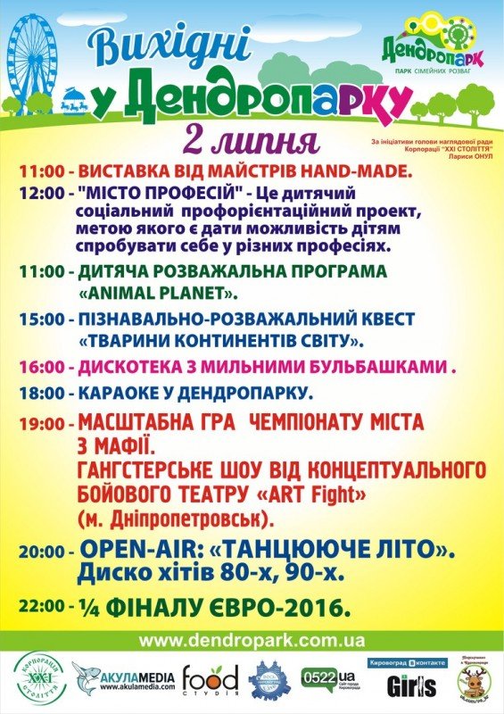 - 12:00- "Місто Професій" - це дитячий соціальний профорієнтаційний проект, метою якого є дати можливість дітям спробувати себе у різних професіях. У парковій зоні розгортається імпровізоване "Містечко Професій". При вході кожна дитина отримує паспорт, карту представлених професій та має можливість «влаштуватись на роботу». Після короткого майстер класу від фахівців своїх галузей, таких як – рятувальник, пожежник, кінолог, вибухотехнік, інспектор ДАЇ, лікар, соціальний працівник, криміналіст, будівельник, продавець, банкір, кухар, кравчиня тощо, діти приступають до "роботи".