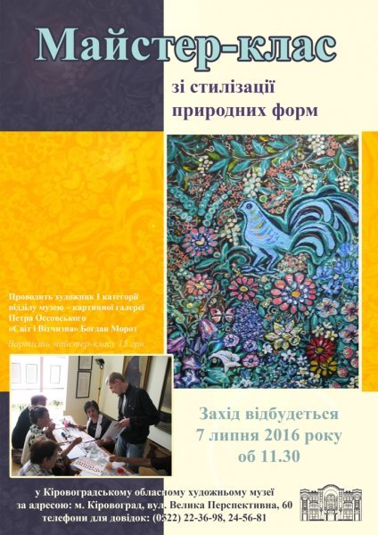 Проводить: Богдан Мороз – художник І категорії відділу обласного художнього музею – картинної галереї Петра Оссовського «Світ і Вітчизна».