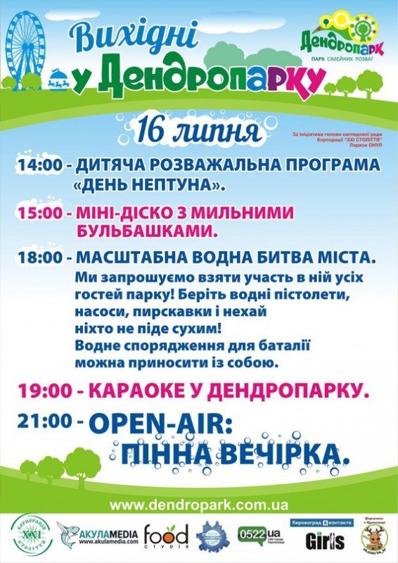 - 18:00 - Масштабна водна битва міста. Ми запрошуємо взяти участь в ній усіх гостей парку! Беріть водні пістолети, насоси, пирскавки і нехай ніхто не піде сухим! Водне спорядження для баталії можна принести з собою.