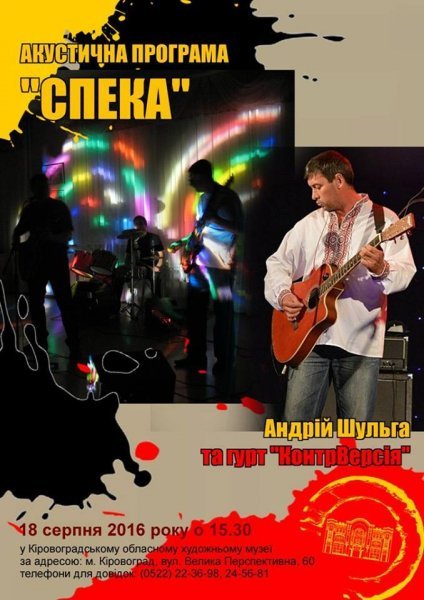 Кіровоградський обласний художній музей запрошує всіх шанувальників гурту "КонтрВерсія" на акустичну програму "Спека" за участю відомого музиканта Андрія Шульги.
