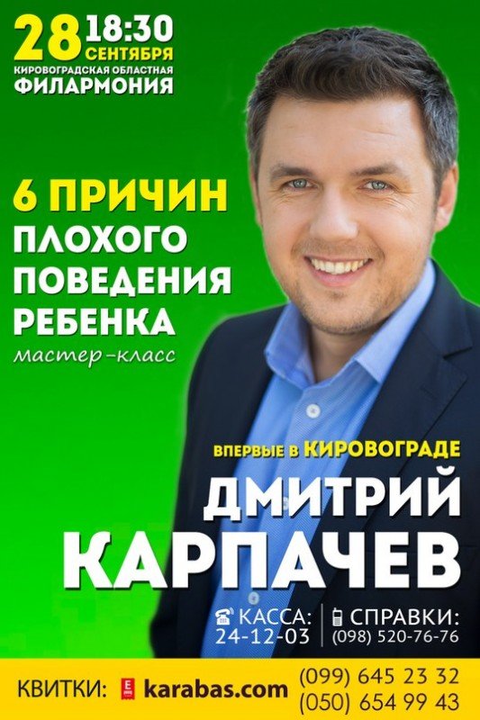 Вперше в Кіровограді Відомий український психолог і телеведучий каналу СТБ Дмитро Карпачов з програмою «6 причин поганої поведінки дитини».