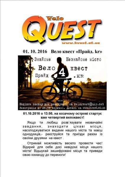 Якщо ти любиш розв`язувати незвичайні завдання, знаходити цікаві місця, насолоджуватися видами нашого міста та маєш однодумців,- реєструйся та приїзди разом із своїми друзями на квест . Отримай можливість весело провести час! Відкрий для себе досі невідомі місця нашого міста! Відшукай зашифровані місця та приведи свою команду до перемоги!