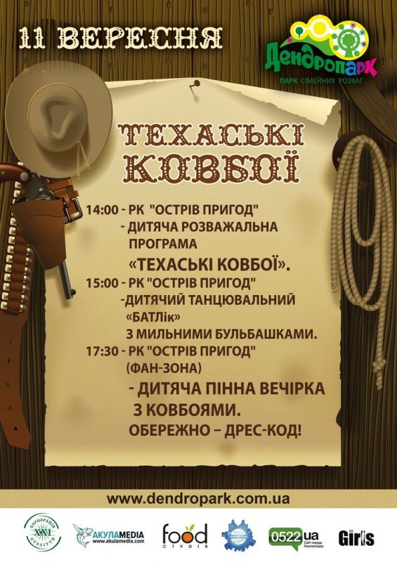 - 14:00 – Розважальний комплекс "Острів Пригод" - Дитяча розважальна програма «Техаські Ковбої»