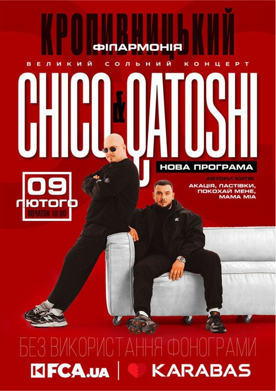 Вже зовсім скоро Chico & Qatoshi дають свій сольний концерт у вашом місті , де разом з вами заспівають улюблені хіти та нові пісні.